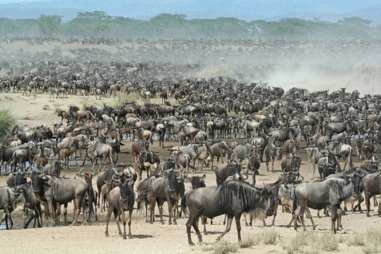 The Great Wildebeest Migration is the world’s largest land mammal movement, involving 1.5–2 million wildebeest, joined by zebra and gazelles, on 800 km circular journey through Tanzania’s Serengeti and Kenya’s Maasai Mara. It is driven by seasonal rainfall and the search for fresh, nutritious grass.